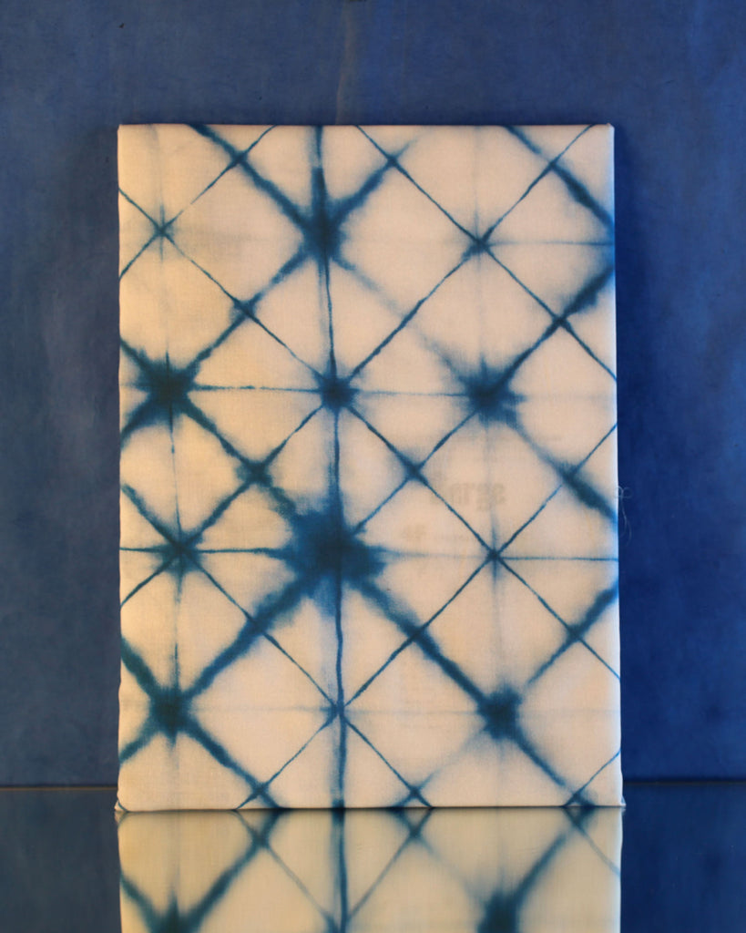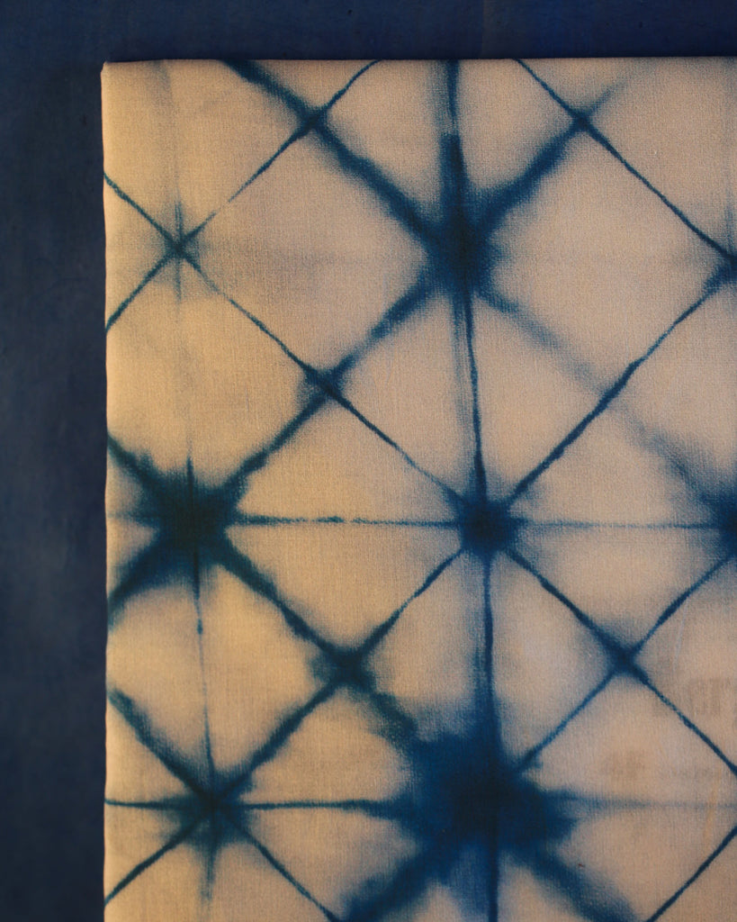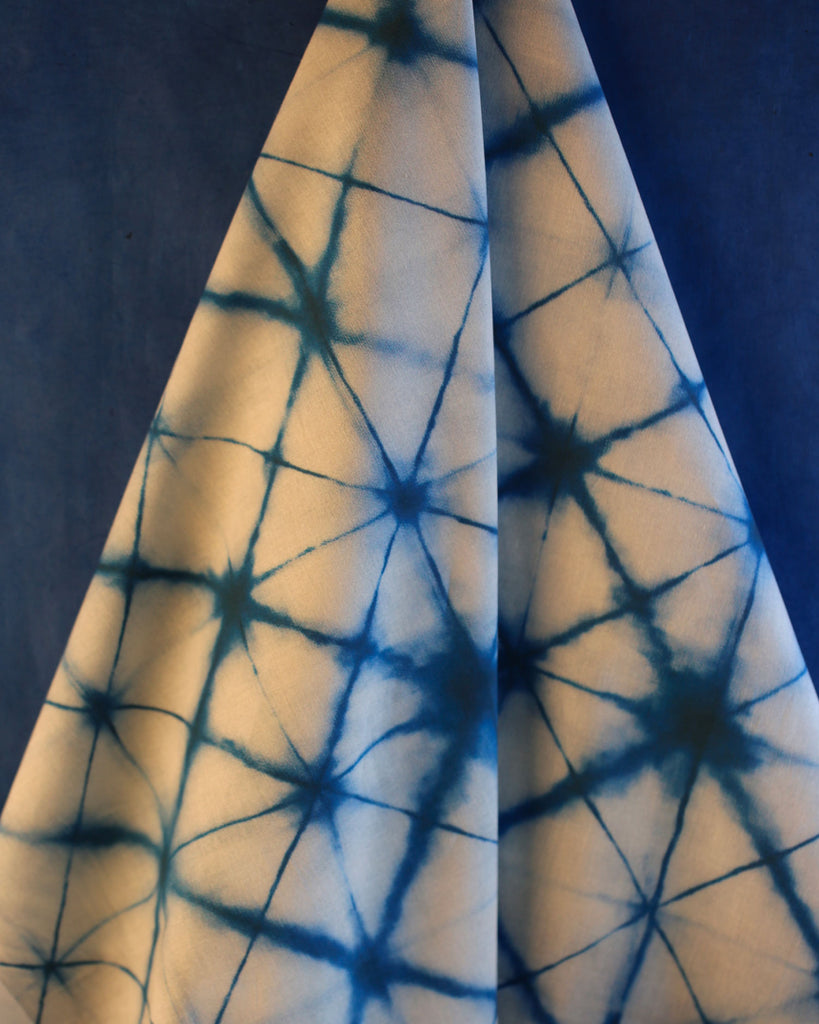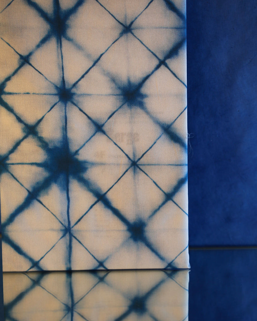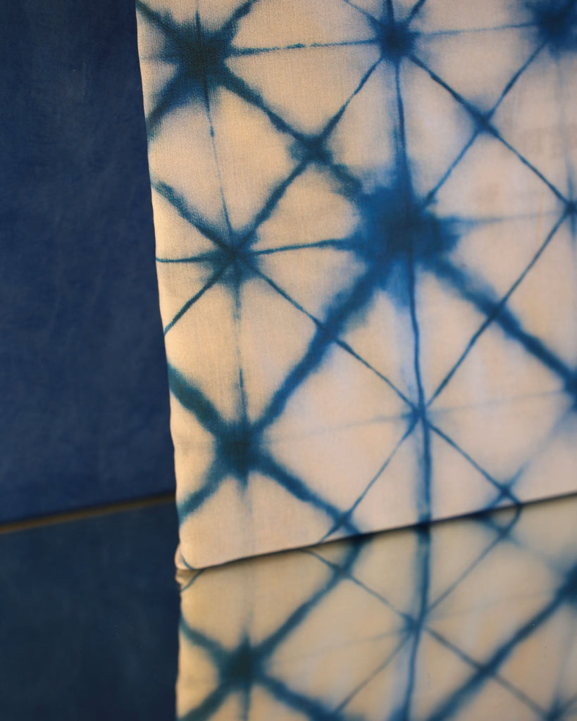 Le tissu Saki s’inspire du savoir-faire ancestral du shibori japonais, cette technique de teinture à la main où chaque pli et chaque nœud devient un geste de création.